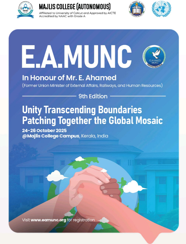 Majlis College (Autonomous) proudly presents the 9th Edition of E.A. MUNC, held in honour of Mr. E. Ahamed, Former Union Minister of External Affairs, Railways, and Human Resources.