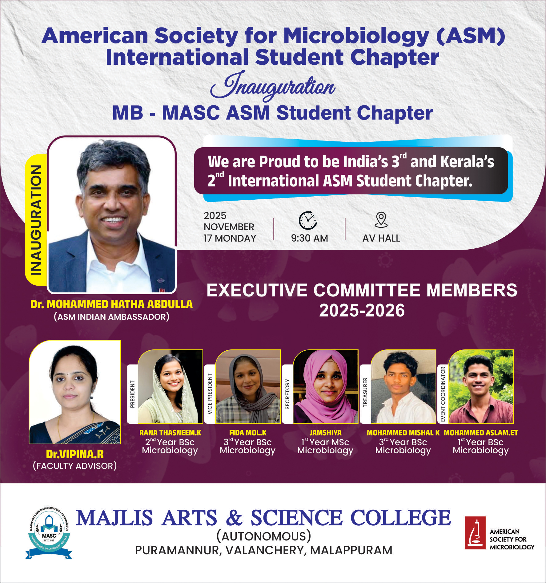 The MB–MASC ASM International Student Chapter was inaugurated at Majlis Arts & Science College, Puramannur, with Dr. Mohammed Hatha Abdulla, ASM Indian Ambassador, serving as the chief guest. The event marked the establishment of India’s 3rd and Kerala’s 2nd ASM International Student Chapter. The inauguration took place on 17 November 2025 at 9:30 AM in the AV Hall. The Executive Committee for 2025–2026, including representatives from BSc and MSc Microbiology, was formally introduced under the guidance of Faculty Advisor Dr. Vipina R.