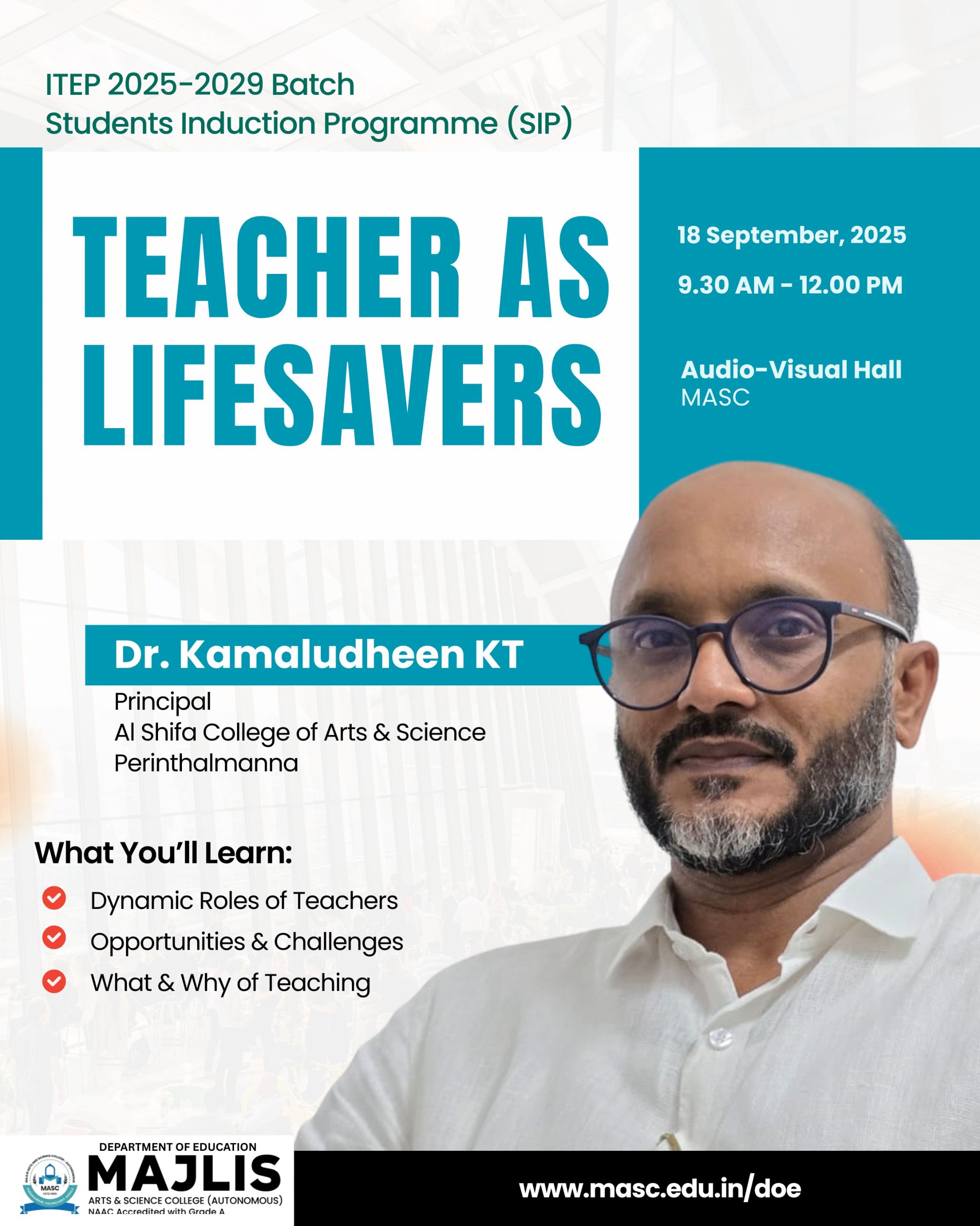 The Department of Education at Majlis Arts and Science College invites all incoming students of the 2025-2029 batch to an insightful session titled "Teacher as Lifesavers". This session will be conducted as part of the Students Induction Programme (SIP), where Dr. Kamaludheen KT, Principal of Al Shifa College of Arts & Science, Perinthalmanna, will share his invaluable perspectives on the teaching profession.