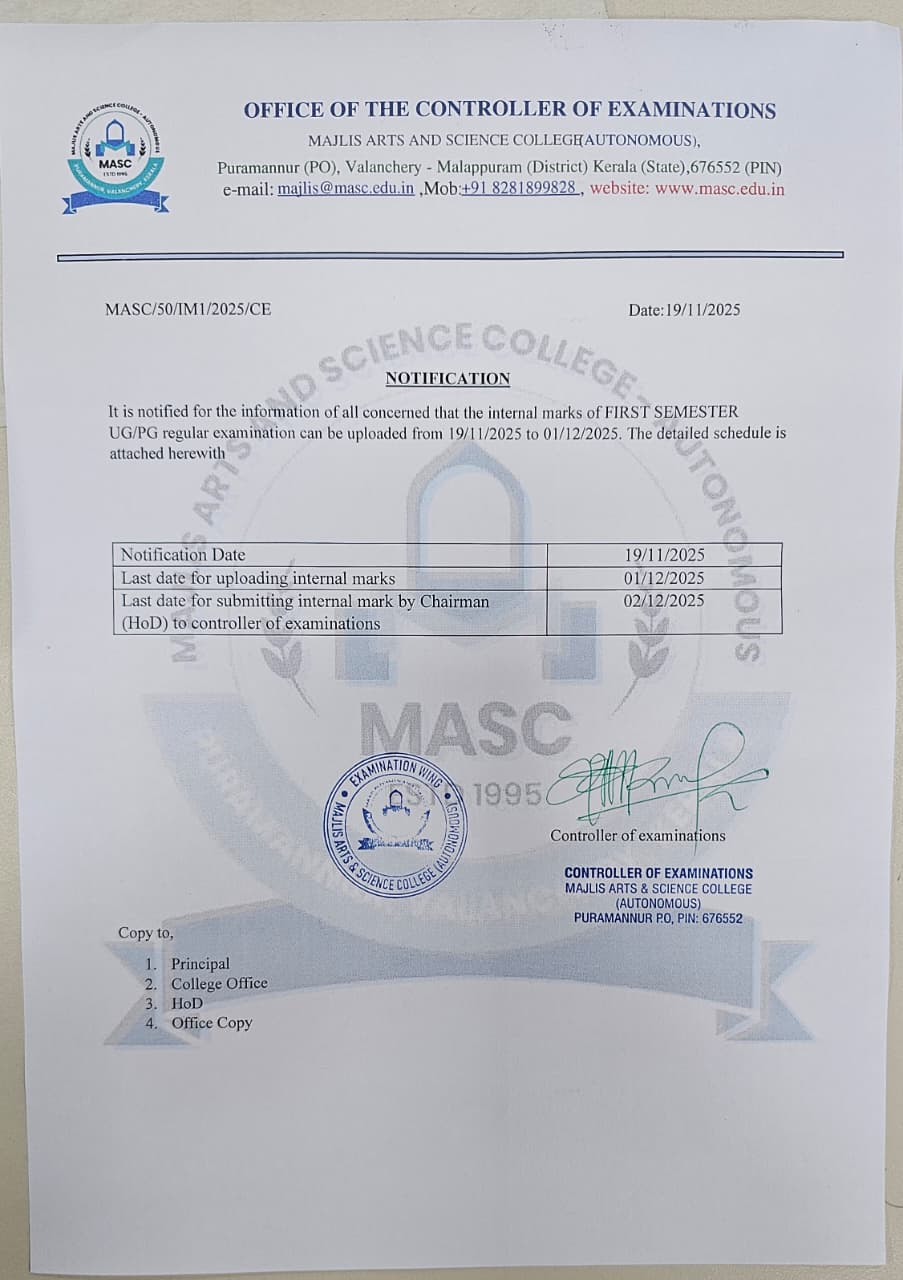 Internal marks for First Semester UG/PG examinations can be uploaded from 19/11/2025 to 01/12/2025, and HoDs must submit the consolidated internal marks to the Controller of Examinations by 02/12/2025. |